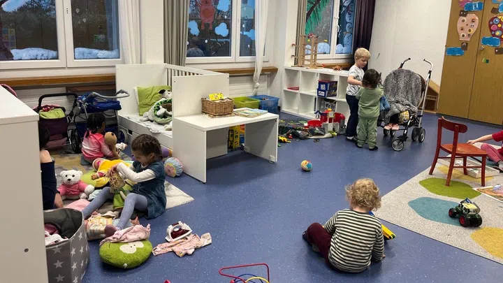 Il di en la Kita cumenza cun in rudè da chant. Quest mument n'è betg mo divertent, mabain dat er la chaschun d'emprender tudestg, ina part dal program «Tudestg per la scola».