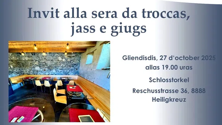 L’Uniun Rumantscha Rezia Bassa organisescha il glindesdi ina saira da dar jass, troccas ed auters gieus. Quella ha lieu en il Schlosstorkel a Heiligkreuz, datiers da Mels.