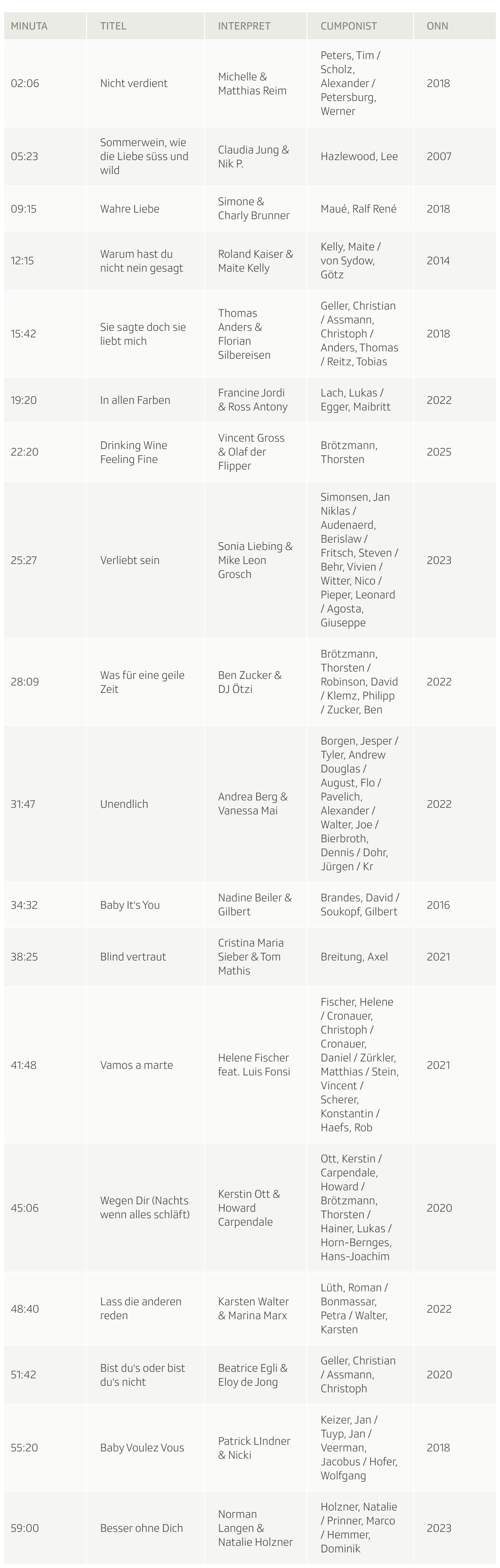 Michelle & Matthias Reim dattan l’entschatta e quai cun lur hit «Nicht verdient». Plinavant tadlain nus Beatrice Egli & Eloy de Jong, Thomas Anders & Florian Silbereisen, Francine Jordi & Ross Antony, Vincent Gross & Olaf der Flipper cun il hit actual «Drinking Wine Feeling Fine» ed anc blers auters.