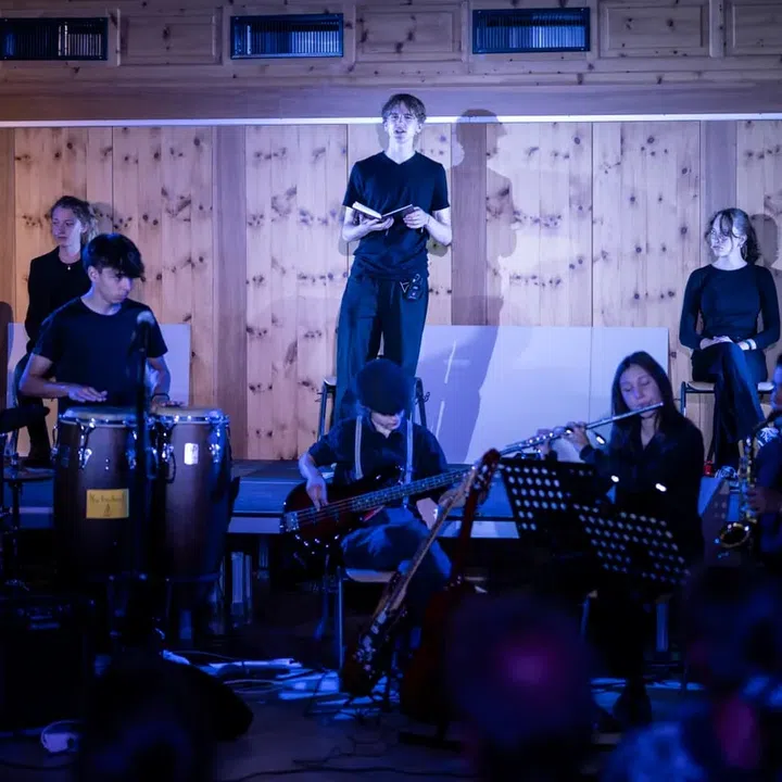 Bild 5 von 6. La truppa da scolars e scolaras dal Lyceum Alpinum Zuoz ch'han preschentà la versiun rumantscha da New World. Bildquelle: Mess a disposiziun da Mayk Wendt.