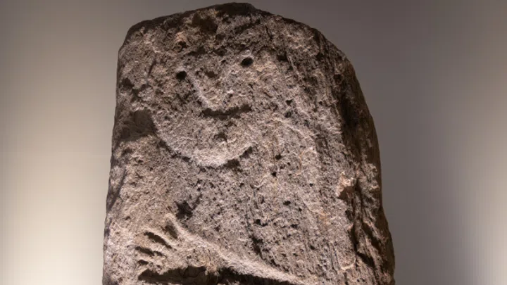 Bild 6 von 11. Guerrier(a) da Sietschen. Stela probablamain masculina cun fatscha rienta, figura arcaica, stilisada cun bratscha enclinada, mauns ed ina cuntgadella. Quarzit. 2000-1400 a.C. Svizra, chantun Grischun, Lumbrein-Sietschen. Bildquelle: © Museum naziunal svizzer.